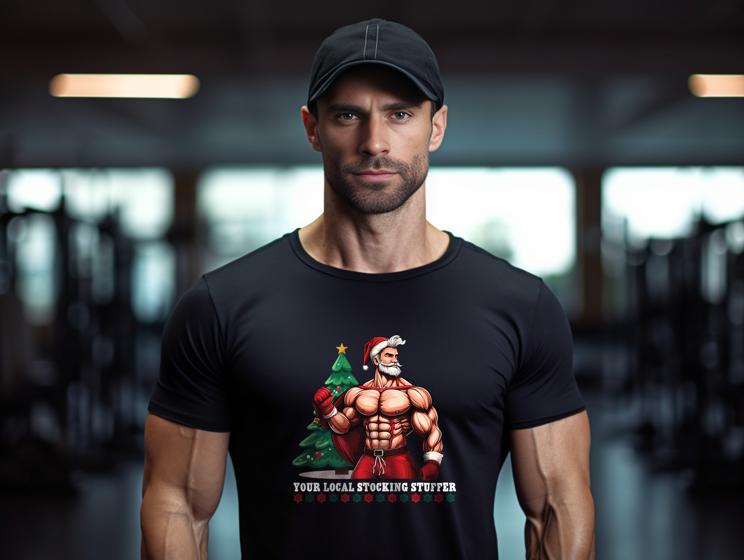 Christmas Funny T-Shirt for Men - 'Your Local Stocking Stuffer' Dad Muscle Tee, Graphic Gym Shirt, Unique Gift for Him, Holiday & Father’s Day