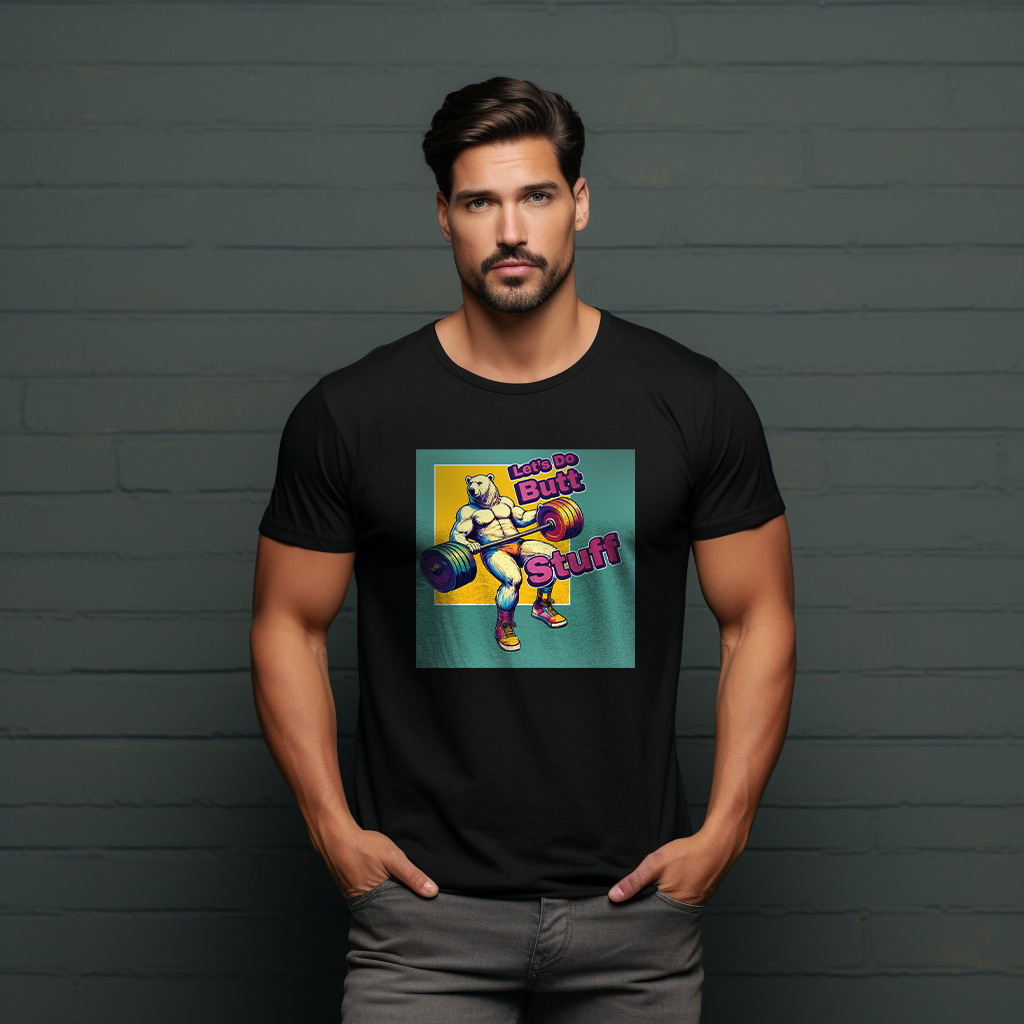 Add some humor and style to your workout wardrobe with this Funny Men's Gym T-Shirt! Featuring a playful 'Let's Do Butt Stuff' graphic, this shirt is sure to get a laugh while you power through your workout. Whether you're hitting the gym or just lounging around, this graphic muscle shirt offers both comfort and personality.